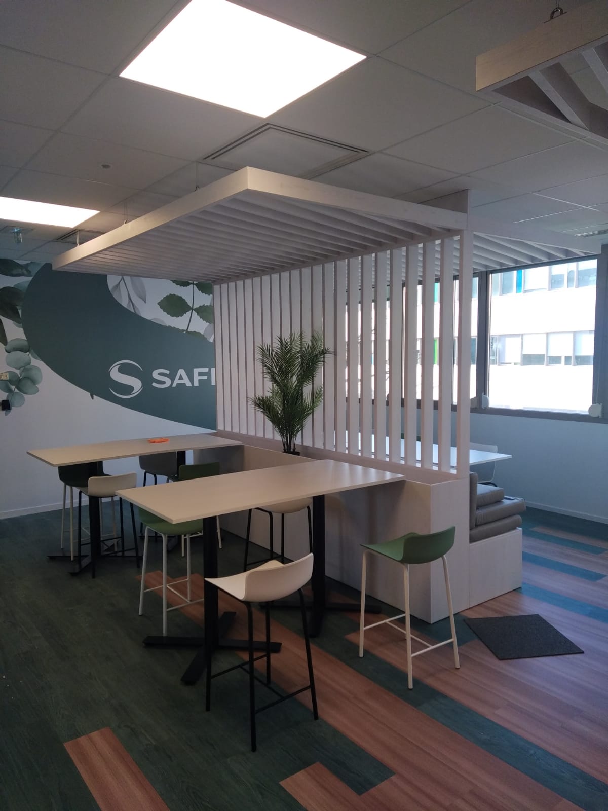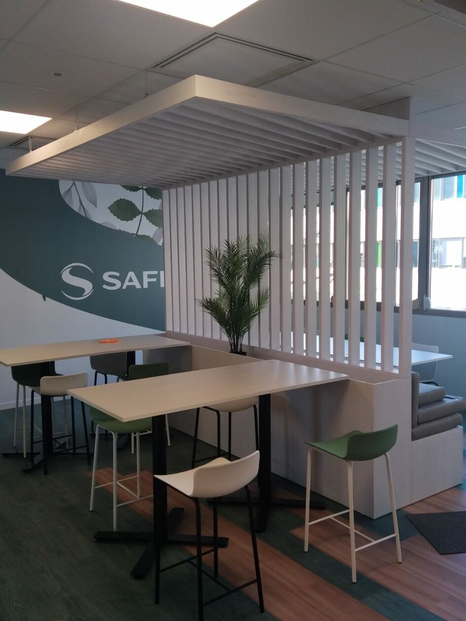 Chaque espace est séparé par des claustras, ce qui améliore le confort visuel et acoustique.
