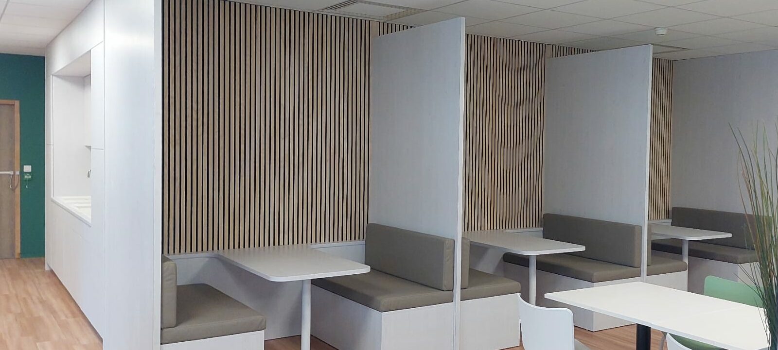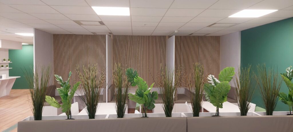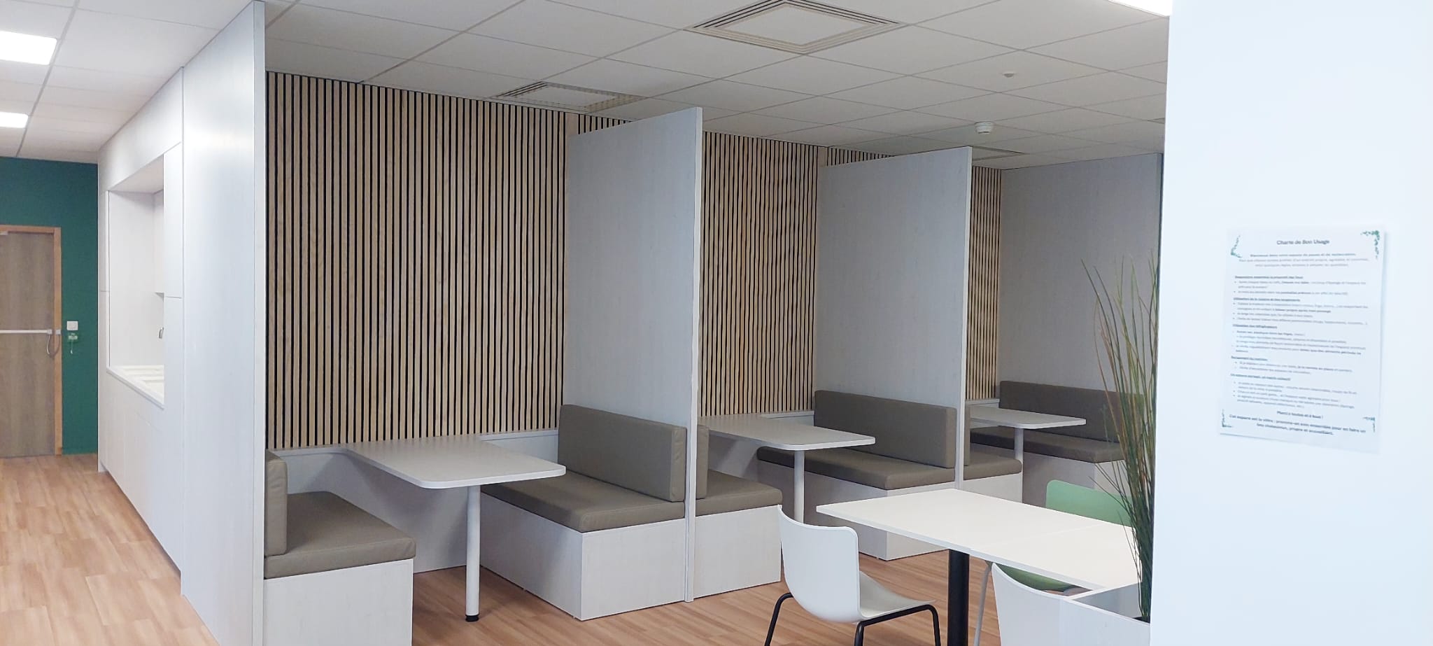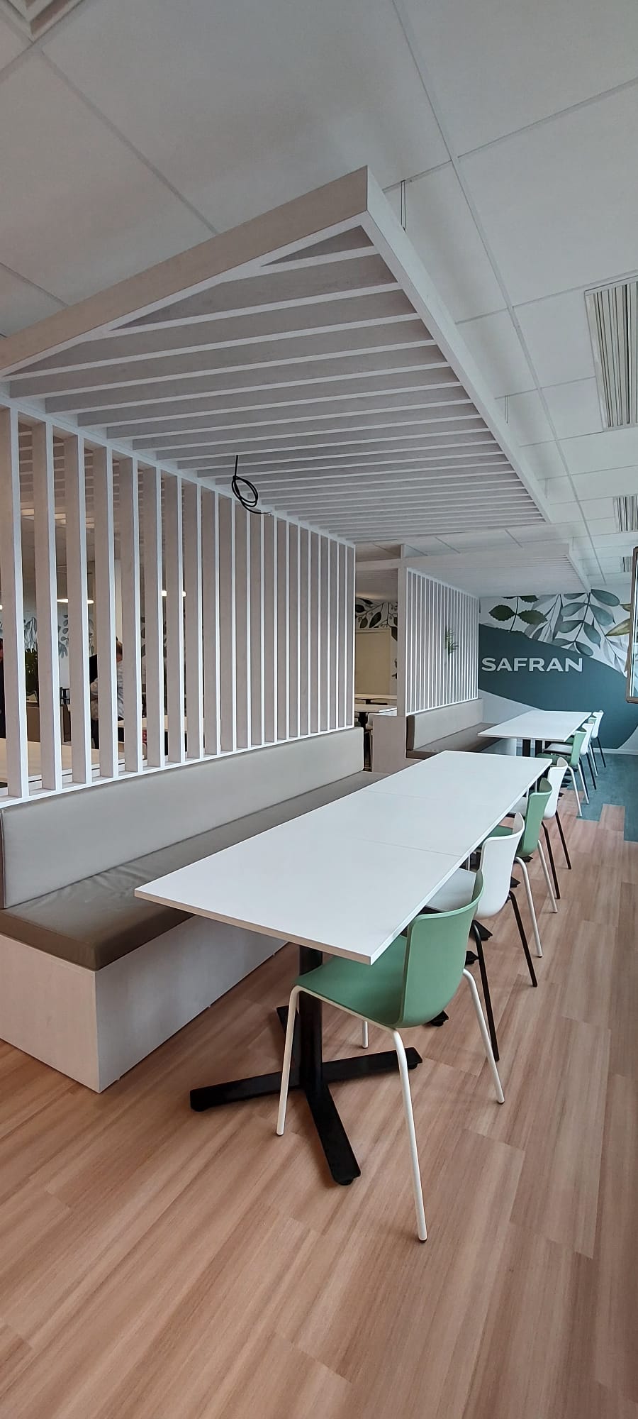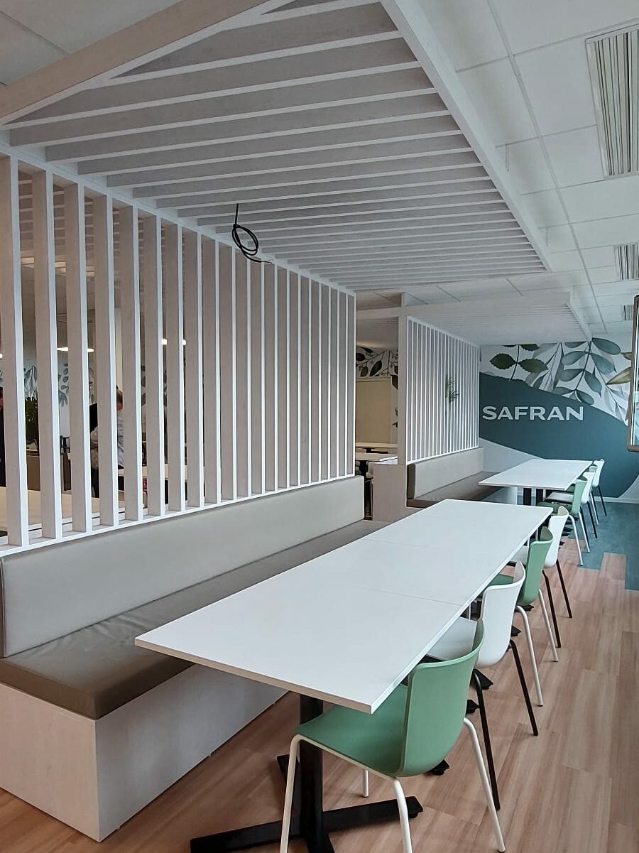 Les panneaux acoustiques en tasseaux de bois, sont en frêne massif de chez Losan. Permettant de compléter les espaces de restauration.