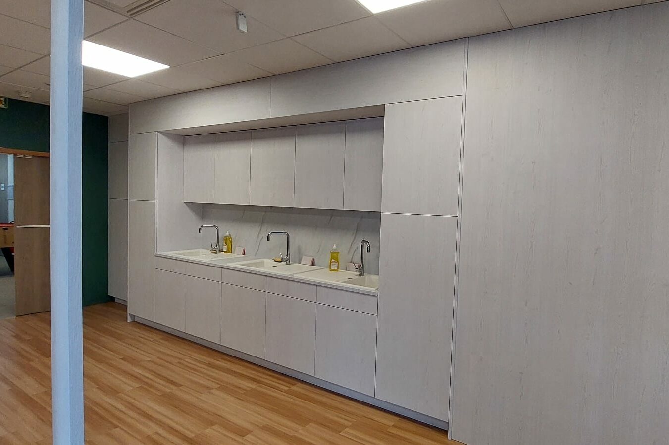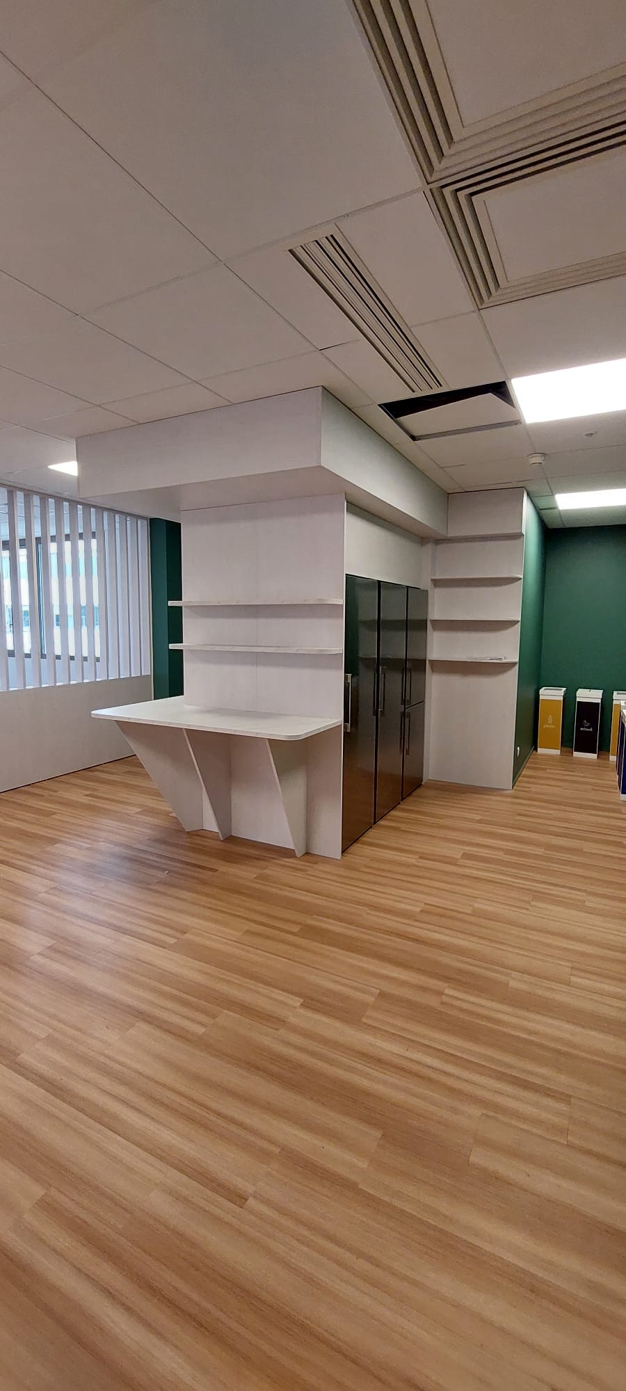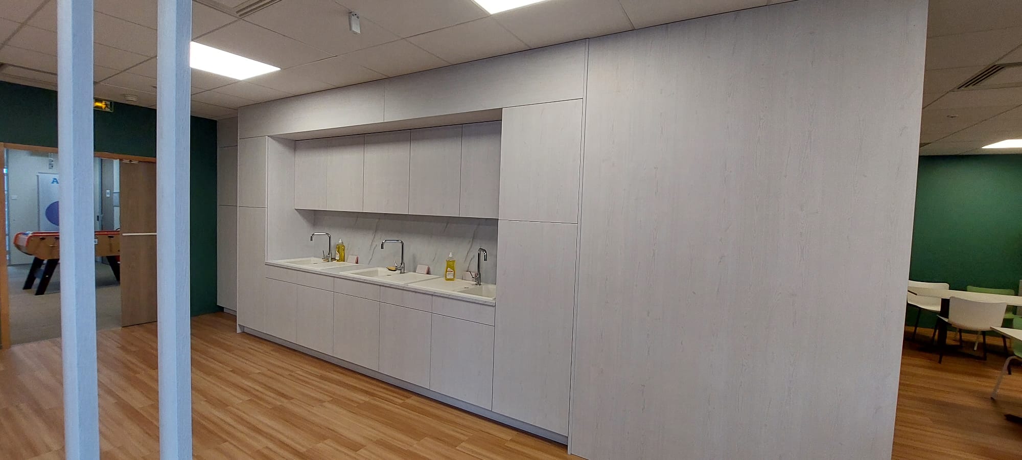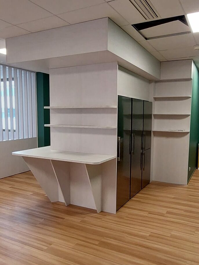 Celle-ci intègre un bloc frigo et micro-ondes, parfaitement adapté aux besoins d’une cafétéria d’entreprise.
