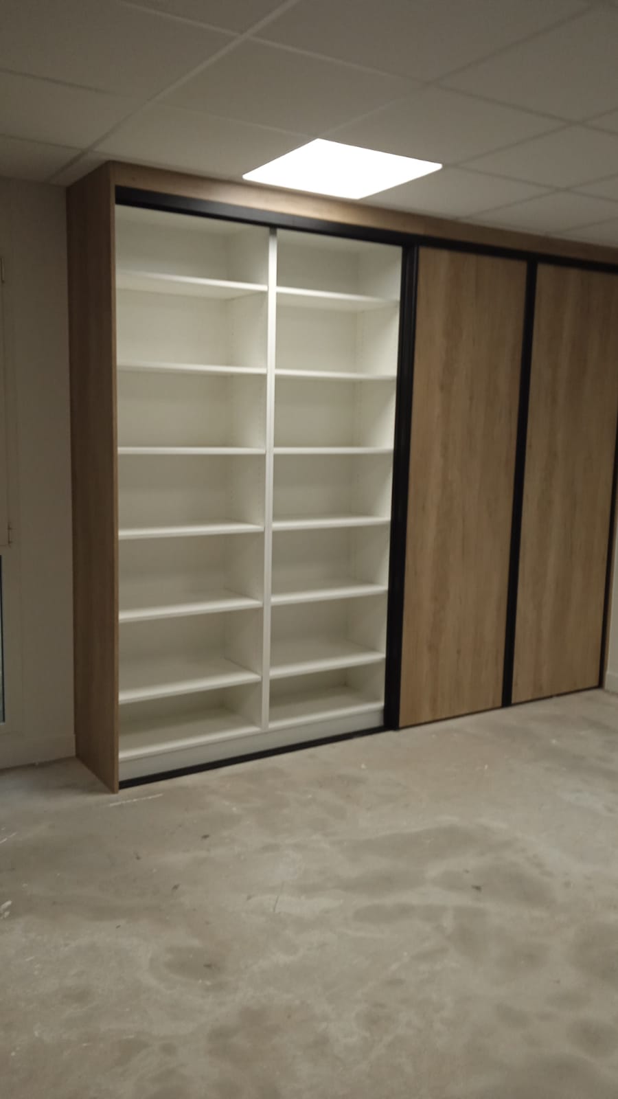 Fabrication sur mesure d’un meuble d’accueil en forme « L », la partie bureau a été stratifié en blanc âme blanche et la partie comptoir en stratifié décor bois chêne Halifax. Nous avons prévu des aménagements avec des placards de rangements en dessous, sans poignées avec un système d’ouverture « touche-lâche ». Les placards coulissants ont été fabriqué en placage chêne, finition huilé. Les habillages muraux ainsi que le claustra ont également été fabriqué avec du placage chêne, finition huilé.