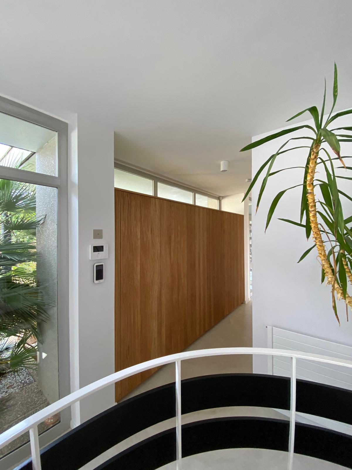 Fabrication sur mesure d’un placard d’entrée. L’aménagement intérieur a été fabriqué en mélaminé 19mm d’épaisseur finition noir mat. Les étagères sont réglables sur taquets. Toutes les charnières viennent de chez blum ainsi que les coulisses et les barres de penderie. Les rangements ont été pensé pour servir de placard d’entrée, pour optimiser l’espace et permettre une grande capacité de stockage. Idée de rangement efficace : le porte chaussure. Les bandeaux leds intérieurs ont été installé dans les parties hautes des caissons colonnes. Les façades en claustra sont des tasseaux fabriqués en chêne massif vernis et fixés sur des panneaux de placage chêne en 16mm, nous obtenons une épaisseur totale des portes de 24mm.